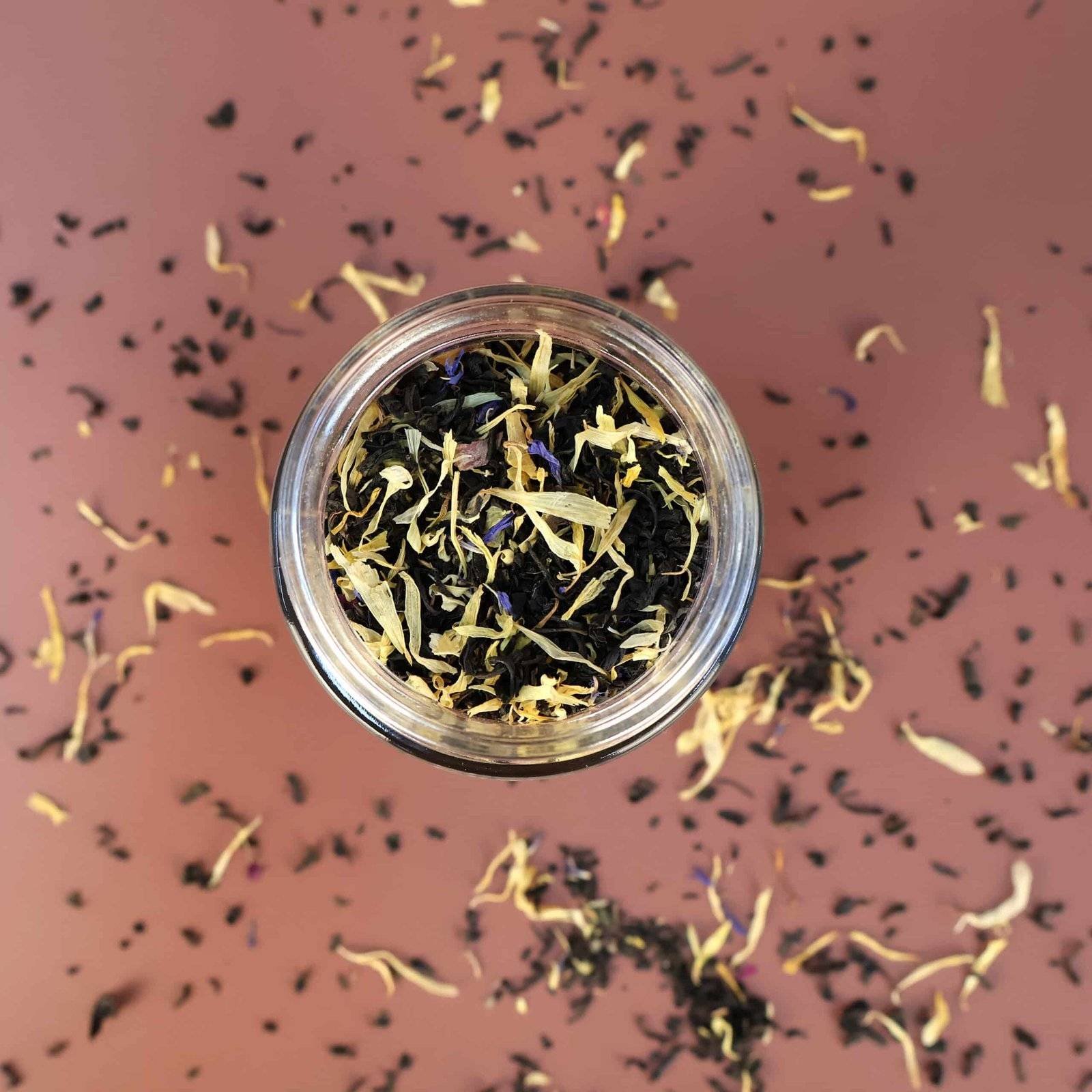 Earl Grey Tea, Rose Petals, Blue Cornflower Petals and Calendula Petals.