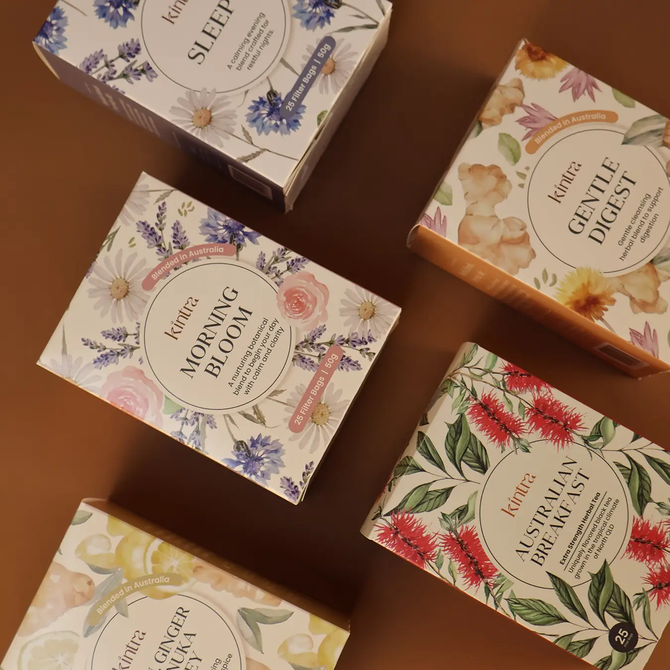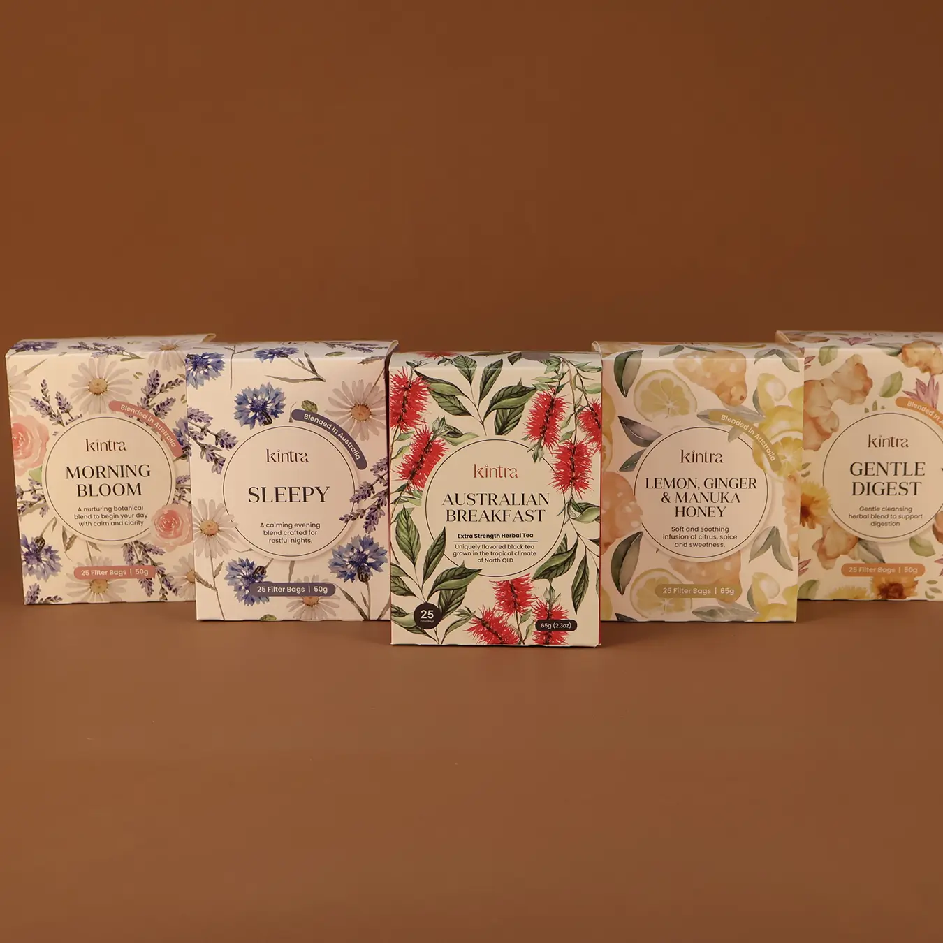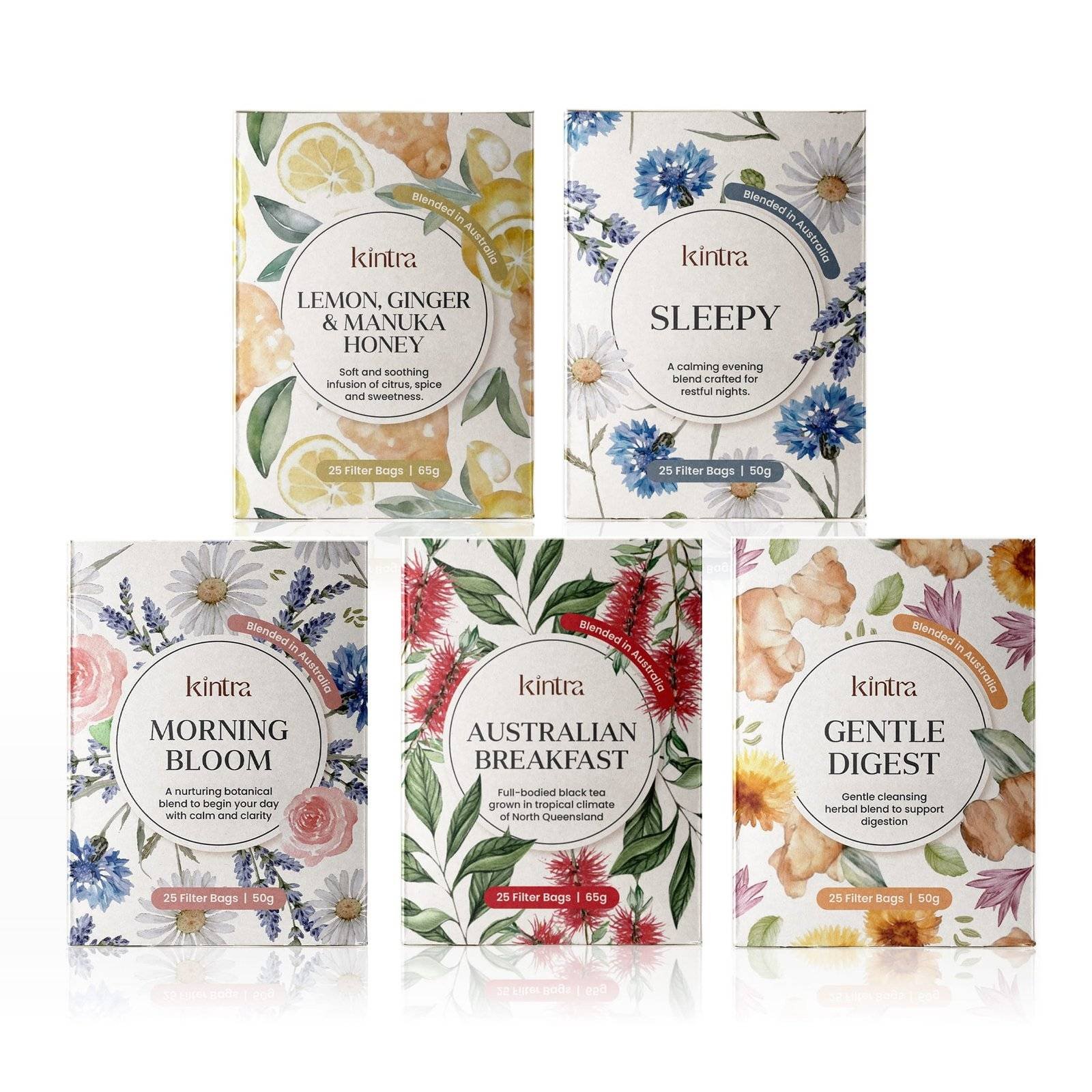 A versatile collection designed to support your daily rhythm, the Kintra Essentials set features five carefully selected filter bag blends, each aligned with a unique wellness intention. From morning clarity to evening calm, it’s your day, steeped with purpose.