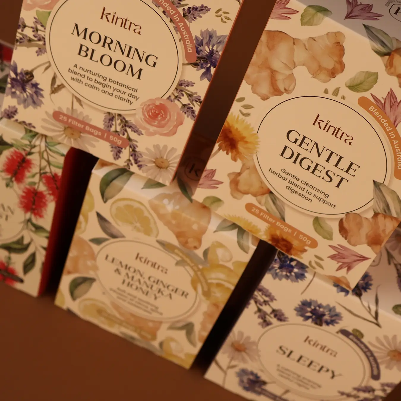 A balanced selection of Kintra’s wellness teas, thoughtfully blended to support your rhythm from morning to night.