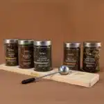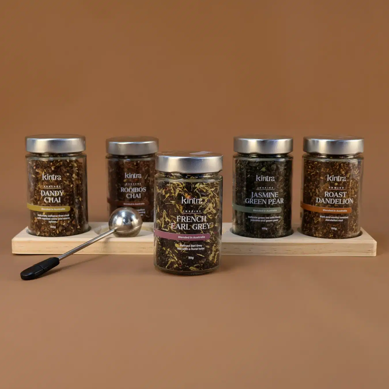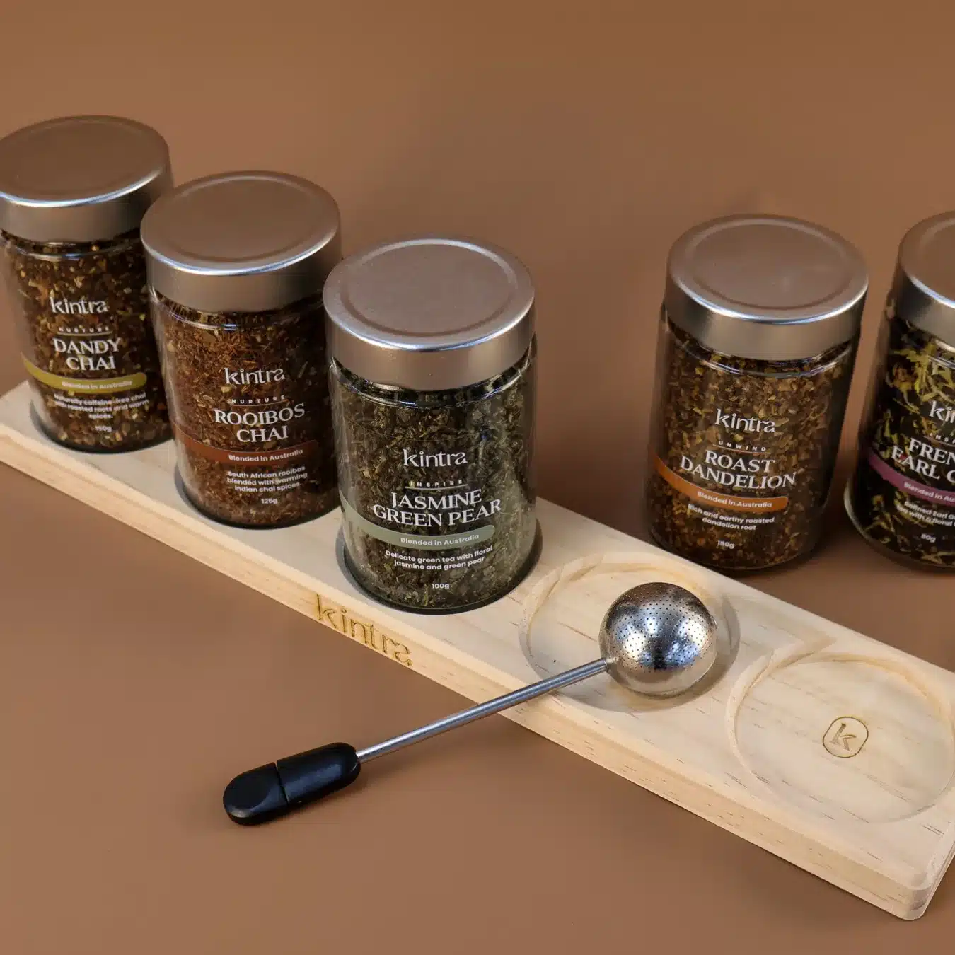 The Signature Collection showcases Kintra’s most expressive blends, a harmony of bold roots, delicate botanicals, and aromatic spices. Featuring five grounding loose-leaf blends, a sleek stainless-steel infuser, and our signature wooden rack, this set is designed to transform your tea corner into a serene, intentional space for daily ritual.