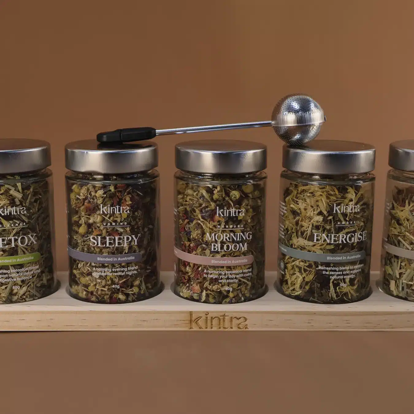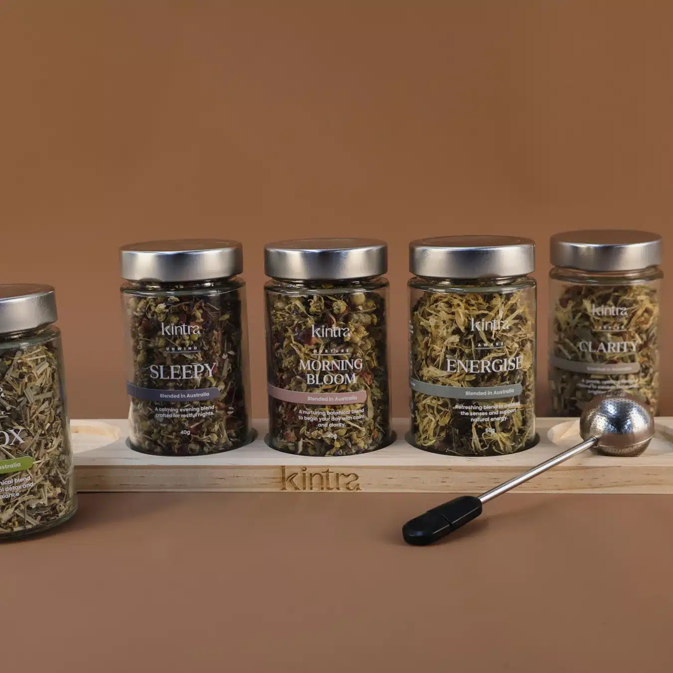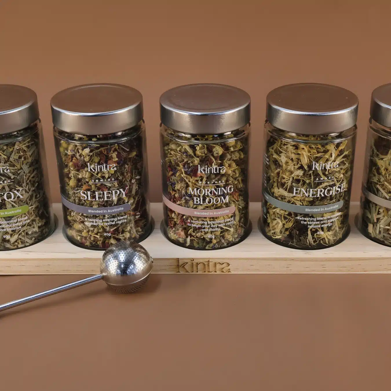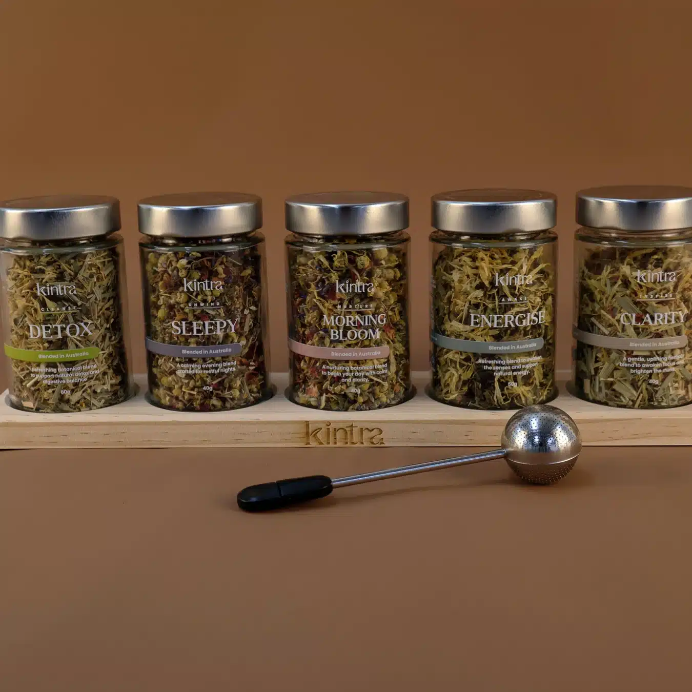 This set is your quiet companion for life’s changing pace, offering herbal support for energy, rest, clarity, or calm. It includes five purpose-driven loose-leaf blends, a stainless steel infuser, and our signature wooden rack, created to bring ease, intention, and a little more balance to your daily ritual.