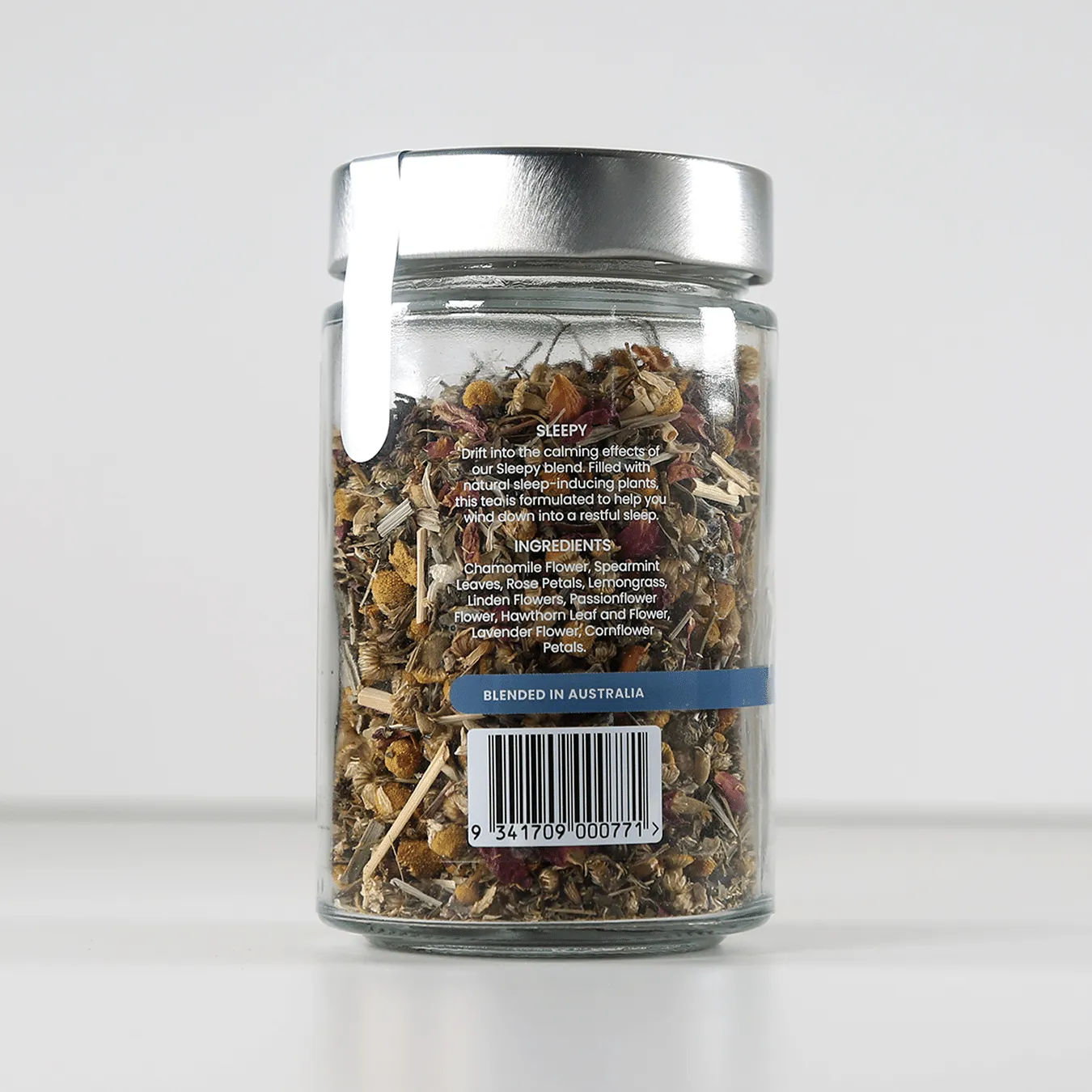 Chamomile Flower, Spearmint, Rose Petals, Lemongrass, Linden Flower, Passion Flower, Hops Flower, Hawthorn Leaf & Flower, Lavender Flower, Blue Cornflower Petals.